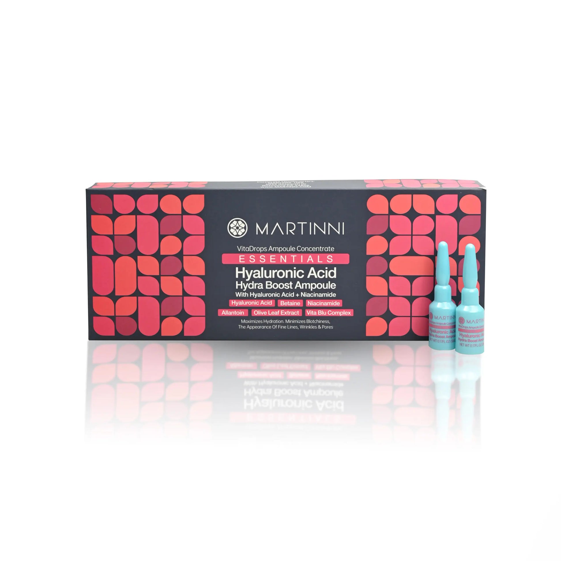 Increases Hydration, Minimizes Blotchiness, the Appearance of Fine Lines, Wrinkles & Pores Key Ingredients: Hyaluronic Acid, Betaine, Niacinamide, Allantoin, Olive Leaf Extract, Vita Blu Complex
